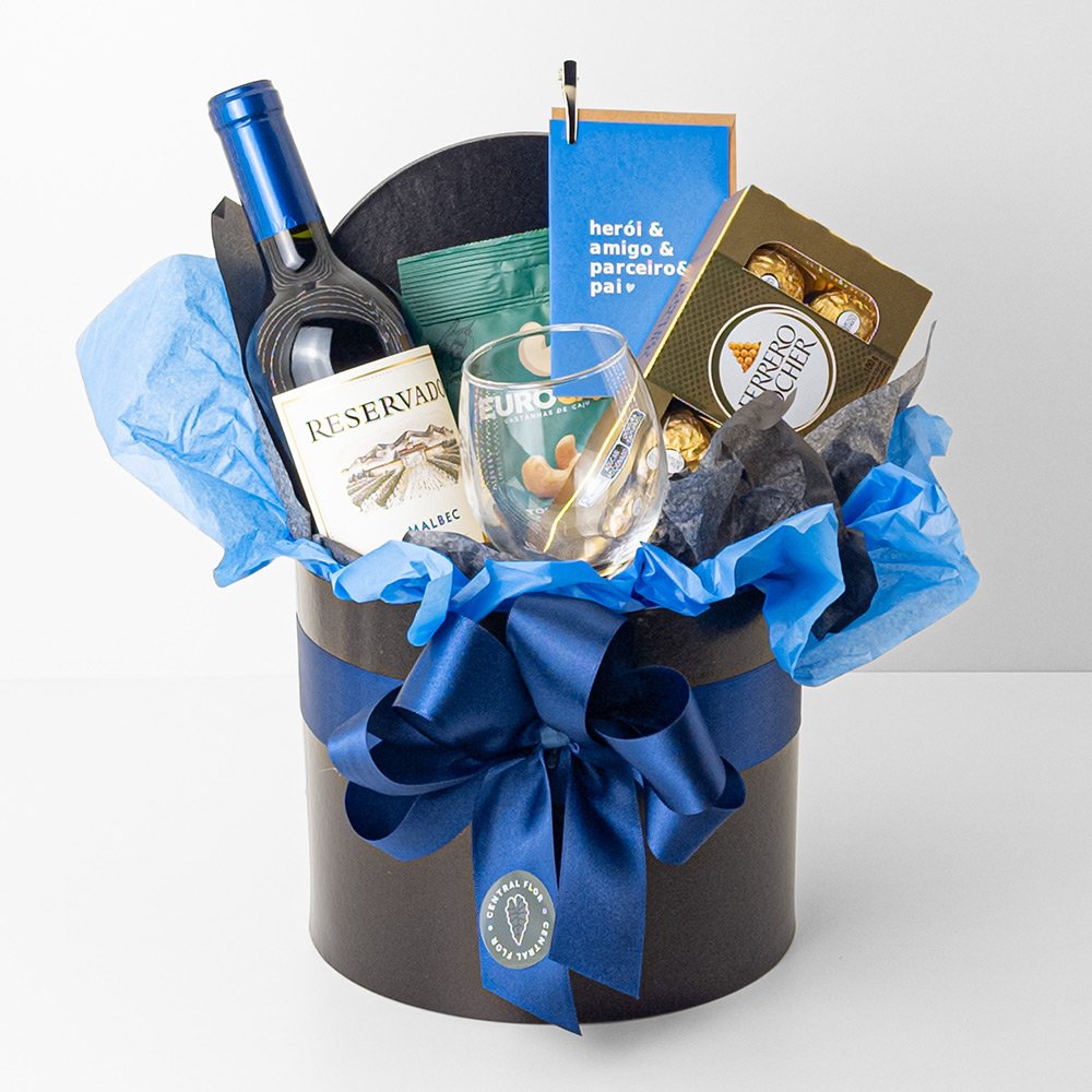 / Box Vinho + Taça de Vidro + Ferrero Rocher + Castanha de Caju + Cartão Com Envelope