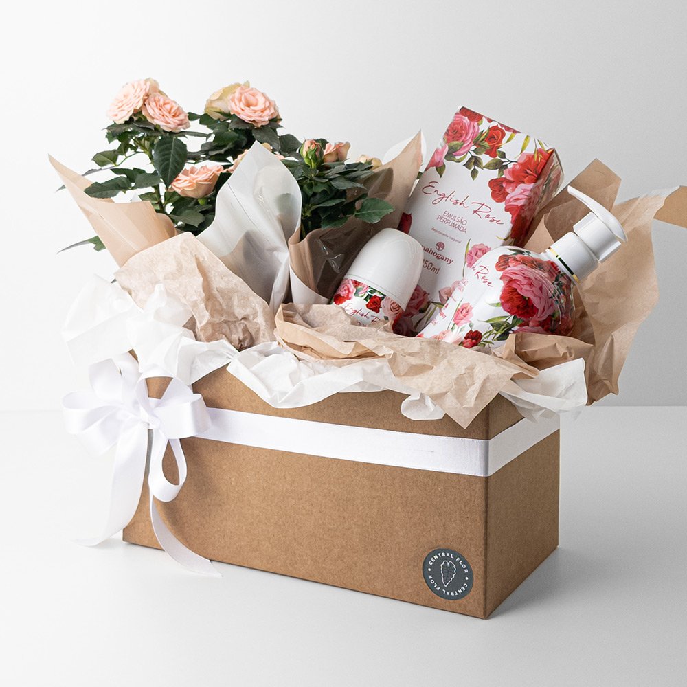 Cesta com Rosa Hidratante Corporal e Desodorante Mahogany