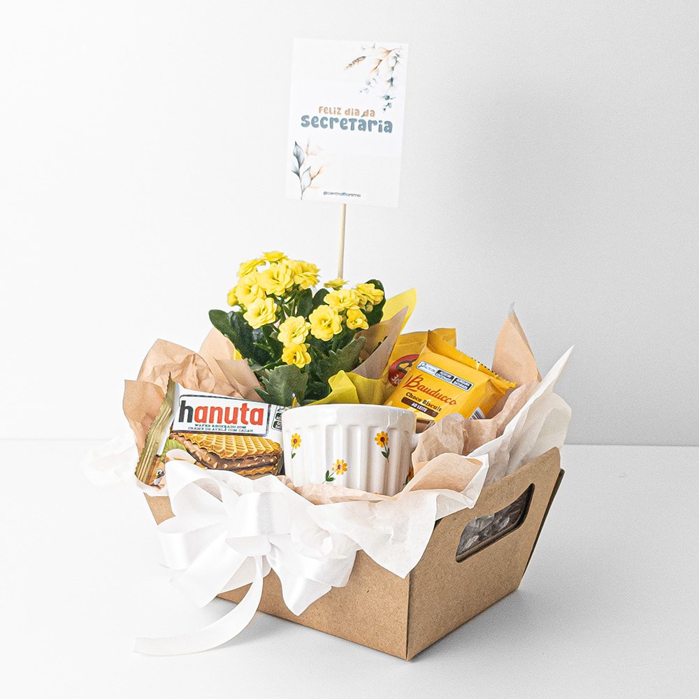 / Cesta Kalanchoe P06 Amarelo + CHOCOBISCUIT + Sachê Cappuccino + Caneca Flores de Girassol • Dia Da Secretaria 2025