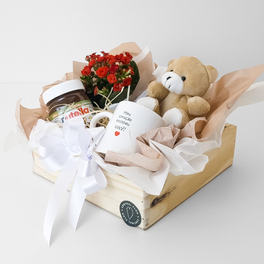 / Cesta Kalanchoe P06 Vermelho + Urso Pelúcia Chaveiro + Nutella 140g + Caneca “Meu Coração Escolheu Você”