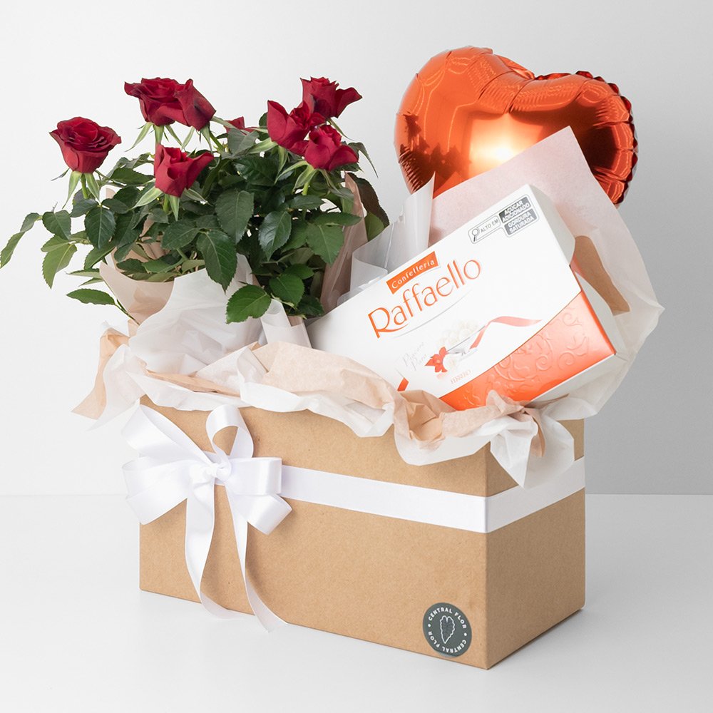 / Cesta Mini Rosa P15 Vermelha + Ferrero Raffaello + Balão Coração 25cm