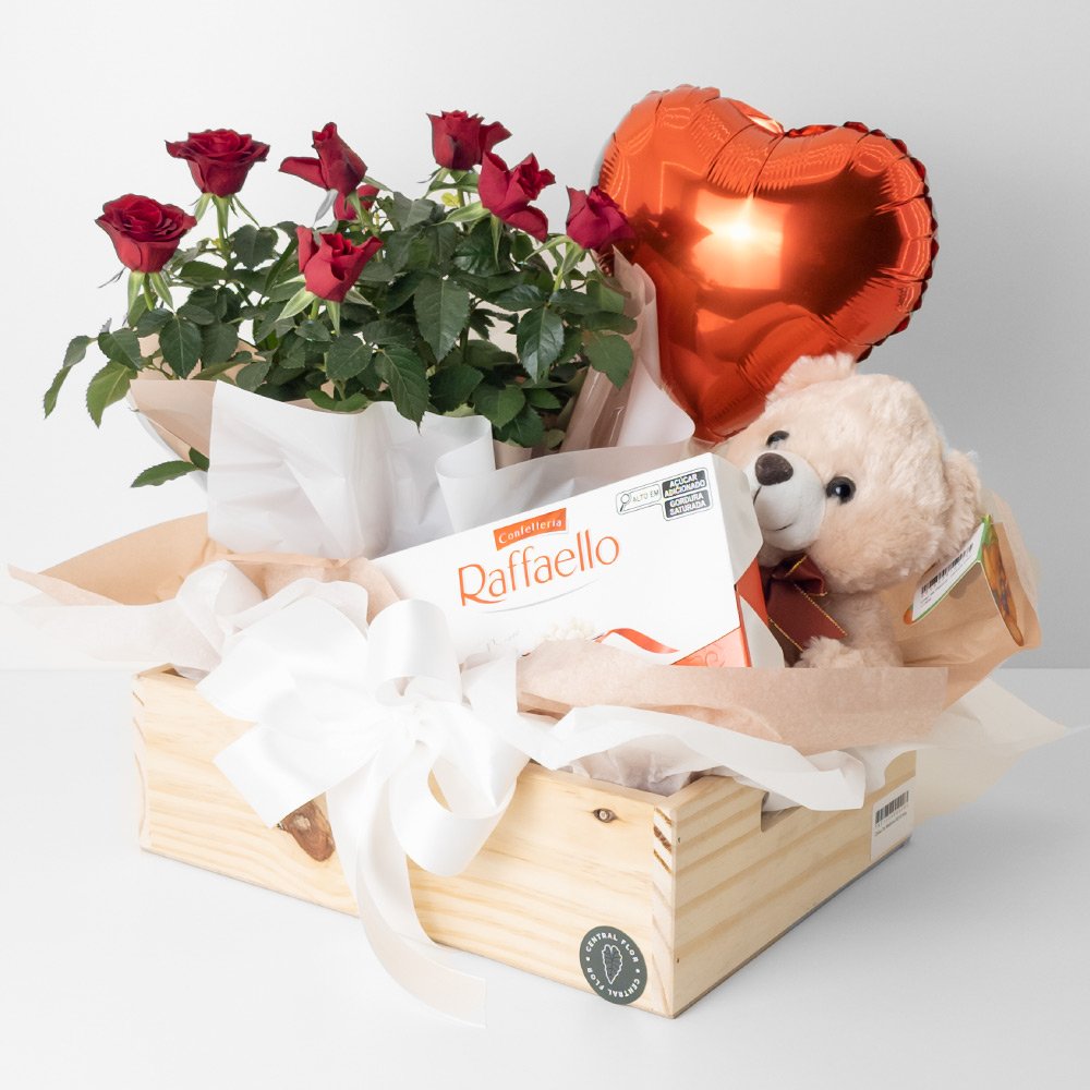 / Cesta Mini Rosa P15 Vermelha + Urso de Pelúcia + Bombom Ferrero Raffaello 90g + Pick Balão Metálico Coração