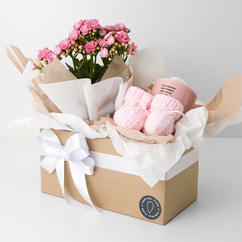 / Cesta Muda Kalanchoe P11 Rosa + Caneca “Há Presentes Que Chegam Para Mudar” + Sapatinho De Bebe