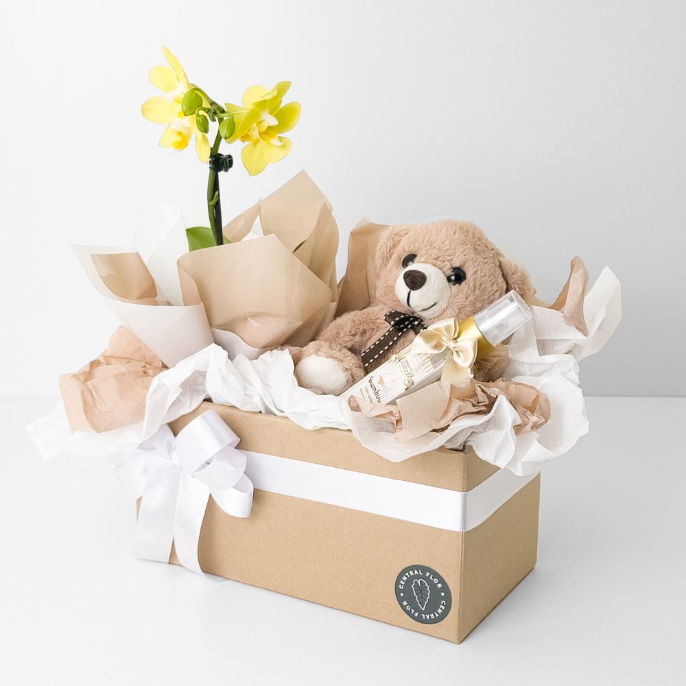Cesta Muda Orquidea P06 + Urso de Pelúcia + Mini Difusor de Aromas Essenza