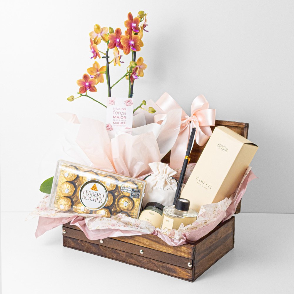 / Cesta Orquidea P12 Phal 2H + Difusor Camélia 200ml Essenza + Vela Aromática Camélia 100g – Dia da Mulher 2026