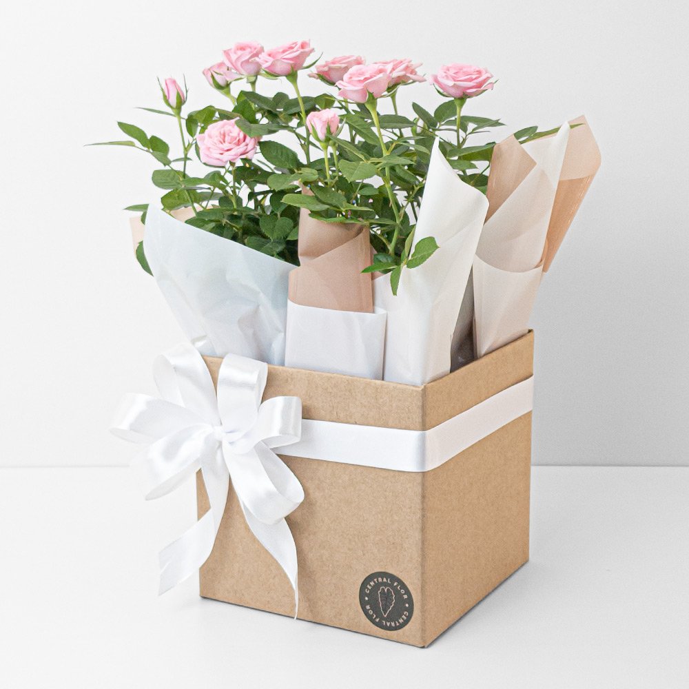 / Mini Rosa P15 Rosa + Cachepô de Papel + Laço